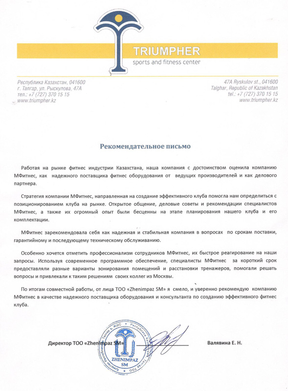 Работая на рынкефитнес-индустрии Казахстана, наша компания с достоинством оценила компанию МФитнес, как надежного поставщикафитнес-оборудования от ведущих производителей и как делового партнера. Стратегия МФитнес, направленная на создание эффективного клуба помогла нам определиться с позиционированием клуба на рынке. Открытое общение, деловые советы и рекомендации специалистов МФитнес, а также их огромных опыт были бесценны на этапе планирования нашего клуба и его комплектации. По итогам совместной работы, от лицаТОО «ZHenimpaz SM» я смело, и уверенно рекомендую компанию МФИтнес в качестве надежного поставщика оборудования и консультанта по созданию эффективногофитнес-клуба .